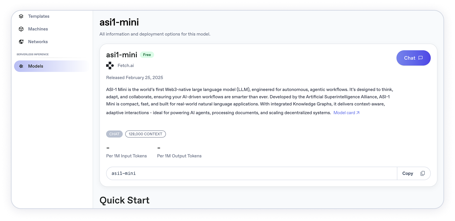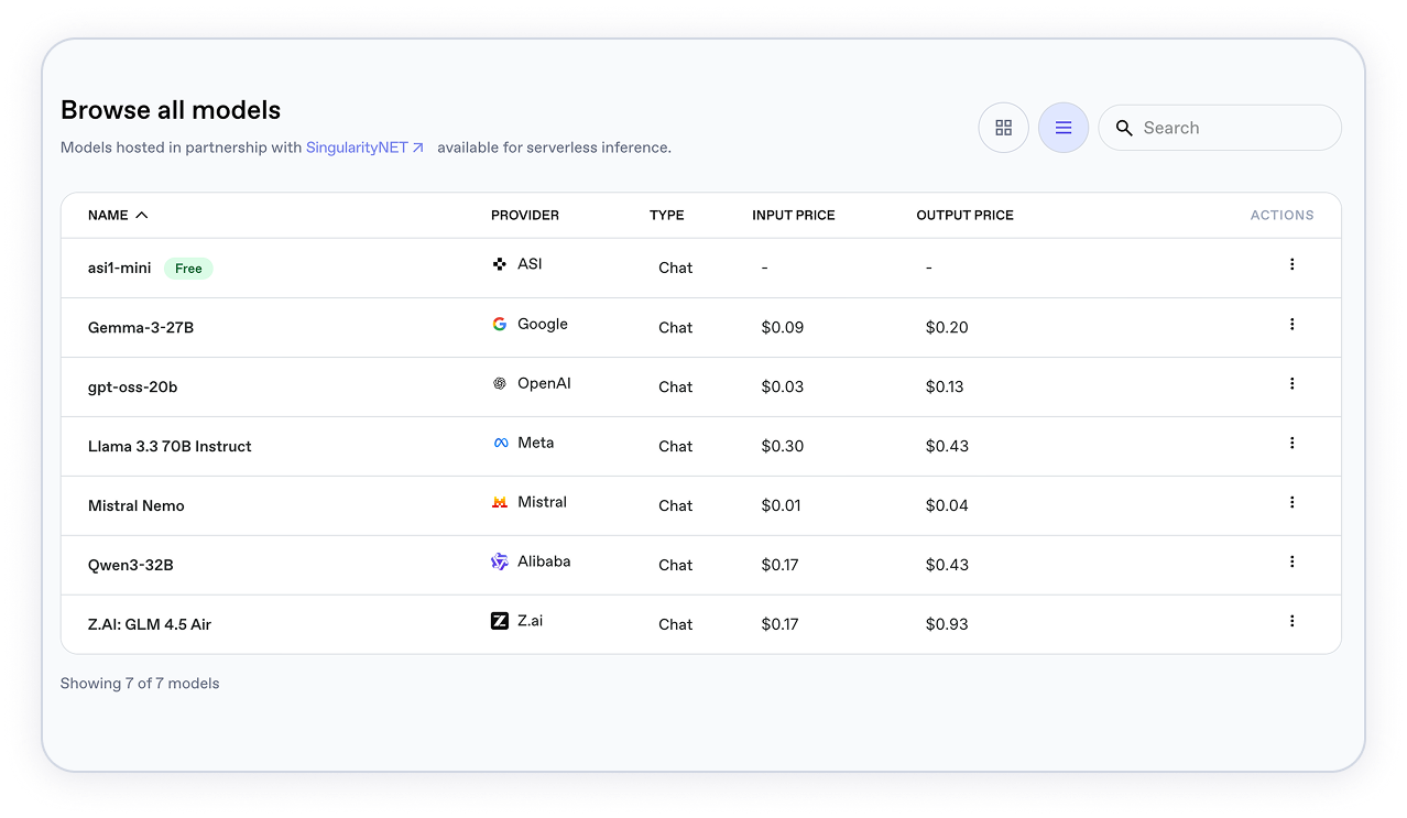 Start with serverless inference, then graduate to a dedicated endpoint with a model of your choice. Access top NVIDIA GPUs per hour. ASI:Cloud offers OpenAI-compatible API with usage analytics, predictable pricing and wallet-based access so you can build, test and ship faster.